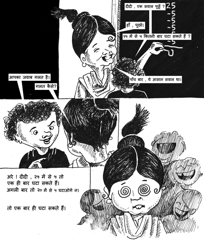 बच्चा: अरे दीदी, 25 में से 5 तो एक ही बार घटा सकते हैं। अगली बार तो 20 में से 5 घटाओगे न। तो एक बार ही घटा सकते हैं।