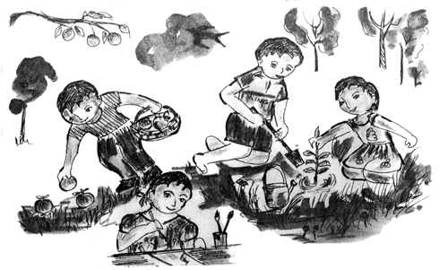 मैं बोला, “इस कविता में ‘छोटे’ का विलोम ‘बड़े’ आ गया। तो कविता में कभी तुकान्त शब्द आते हैं, कभी एक अर्थ वाले शब्द भी आते हैं तो कभी विलोम शब्द भी आ जाते हैं। कविता की मुख्य बात है पढ़ने-सुनने में अच्छा लगे। इस कविता में देखो, कवि छोटे-छोटे हाथों की बात कर रहा है जिनसे कई बार हम बड़े-बड़े काम करते हैं। हम चित्र में देख रहे हैं, बच्चे पेड़-पौधों में पानी दे रहे हैं या गुड़ाई कर रहे हैं।” बच्चे कहने लगे, “ऐसे ही हम भी अपने स्कूल में करते हैं।”