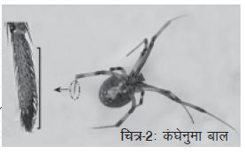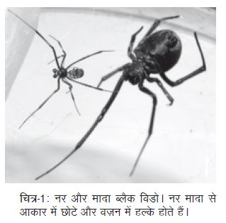 त्वचा त्यागना एवं लैंगिक द्विरूपतास्पाइडरलिंग जैसे-जैसे बड़े होते हैं, अपनी पुरानी त्वचा को निकाल देते हैं। यह साँप की केंचुली निकालने जैसा ही है। पुरानी त्वचा त्यागते समय कुछ देर के लिए स्पाइडरलिंग अपंग हो जाते हैं। इस समय शिकारी के आक्रमण करने पर ये बचाव में असमर्थ होते हैं। वयस्क होने तक नर ब्लैक विडो 7 बार एवं मादा 9 बार अपनी पुरानी त्वचा बदलते हैं। अन्तिम बार त्वचा त्यागने के बाद ही नर में वीर्य को मादा जननांग में डालने के लिए फूले हुए पेडीपेल्प विकसित होते हैं। नर मादा से आकार में छोटे और वज़न में हल्के होते हैं। नर का शरीर पूर्णत: काला होने की बजाय सफेद एवं काले रंग की धारियों वाला होता है। इस प्रकार से नर एवं मादा ब्लैक विडो में स्पष्ट लैंगिक द्विरूपता दिखाई देती है। नर तीन महीनों में वयस्क हो जाते हैं किन्तु मादा को वयस्क होने में छ: महीने लगते हैं।