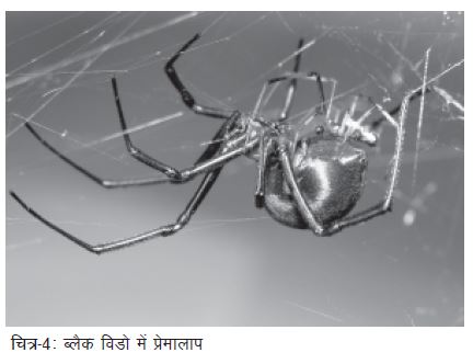 नर ब्लैक विडो भी जाले में मादा की उपस्थिति को भाँपकर प्रेमालाप में जाले के धागों को गिटार के समान बजाने लगता है। इन कम्पनों को केवल उसकी प्रजाति की मादाएँ ही समझ सकती हैं। नर पेट को लगातार दोनों तरफ हिलाता है तथा मादा के समीप पहुँचने के लिए कुछ धागों को तोड़ता है। इससे मादा जाले में एक ही जगह तक सीमित हो जाती है। इस तरह मादा द्वारा नर को खा जाने के जोखिम को कम किया जाता है। नर मादा के ऊपर भी अपने रेशमी धागों को लपेटकर उसे कैद कर लेते हैं। रेशमी धागों में लगे रसायन मादा को शान्त रखते हैं तथा नर को मादा के आक्रमण से बचाए रखने का उपाय भी है। इस दौरान नर द्वारा की गई एक भी गलती पर मादा उन्हें शिकार समझती है और नर को मौत की सज़ा मिलती है।