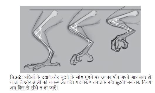 पक्षियों के शरीर में टाँगें, कण्डरा, उंगलियाँ और पेशियाँ इस तरह से बनी होती हैं कि उनका डालियों पर बैठना लगभग स्वत: ही हो जाता है (या यूँ कहें कि इससे अलग ढंग से बैठना उनके लिए सम्भव ही नहीं है)। कैसे? पहले एक पक्षी की टाँग का चित्र (चित्र-1) देखें।