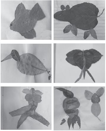 इसके बाद बच्चों ने इन पत्तियों का इस्तेमाल करके कुछ जानवरों, पक्षियों व अन्य वस्तुओं की आकृतियों को भी उभारा जो कल्पना व रचनात्मकता से परिपूर्ण थीं। कक्षा के कुछ बच्चे जो ऐसी कोई आकृति बनाने में आत्मविश्वास महसूस नहीं कर रहे थे, उन्होंने किताब में दर्शाई गई पत्तियों से बनी आकृतियों को देख-देखकर वैसी ही आकृतियाँ बनाने की कोशिश की। बच्चों के इस कार्य की झलकियाँ आप आगे तस्वीरों में देख सकते हैं।