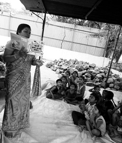 मुस्कान द्वारा संचालित नवग्रह बस्ती के पुस्तकालय में मैंने ओ हरियल पेड़ कहानी पढ़कर सुनाई। जिस समूह में कहानी सुनाई गई उसमें 5 बच्चे ऐसे थे जिनकी उम्र 4-6 वर्ष होगी और 2 बच्चे तो ऐसे थे जो अभी स्कूल भी नहीं जाते थे। कहानी सुनाने के बाद बाबू ने कहा, “मुझे यह कहानी पढ़ना है।” उसकी उम्र 5-6 वर्ष होगी और अभी उसने स्कूल जाना भी शुरू नहीं किया है। मैंने उसे किताब दे दी। उसने सबसे पहले किताब का नाम पढ़ा। उसके बाद उन दो पन्नों को देखकर छोड़ दिया जहाँ कुछ भी नहीं लिखा था। फिर जहाँ से चित्र और टेक्स्ट शुरू होता है वहाँ से उसने कहानी पढ़ना शुरू किया। उसने चित्र देखते हुए पूरी कहानी सही-सही पढ़कर सुनाई। बस कहीं-कहीं वो कुछ शब्दों की जगह या तो अपने शब्द जोड़ रहा था या पूछता जा रहा था। जैसे कहानी में एक जगह ‘ग्वाला’ शब्द था। उसने पूछा, “क्या लिखा है?” वो ठीक वैसे ही पढ़ रहा था जैसे कि लिखा हुआ पढ़ रहा हो, पर वो लिपि नहीं पहचान रहा था बल्कि जो चित्र थे, उनको देखते हुए, सुनाए गए वाक्यों को याद करके पढ़ रहा था। पूरी कहानी पढ़ लेने के बाद उसने बड़े गर्व से अपने दोस्त को कहा, “देखा, मैंने पूरी कहानी पढ़ ली।” उस किताब को पढ़ने के बाद उसने और भी दो किताबें खुद से पढ़ने के लिए चुनीं। इस बार उसके पास कुछ भी याद करने के लिए नहीं था क्योंकि इस बार किताब में क्या लिखा है उसने किसी से भी नहीं सुना था, पर दो अति महत्वपूर्ण चीज़ें उसके पास उपलब्ध थीं जो उसे किताबें पढ़ने के लिए प्रेरित करने को काफी थीं। एक तो उसके द्वारा हाल ही में पढ़कर सुनाने से मिला, पढ़ लेने का आत्मविश्वास और दूसरा, किताब के चित्र जिनके आधार पर वह अनुमान लगाते हुए पढ़ रहा था। इस बार उसने एक बड़ी किताब चुनी जिसमें टेक्स्ट ज़्यादा और चित्र कम थे। 15-20 मिनट तक वह अपने मन से सोच-सोचकर पढ़ता रहा और चित्रों के आधार पर उसने अपनी ही एक कहानी गढ़ ली।