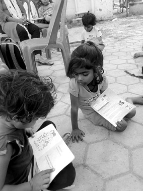 एक बार जब मैं बिसन खेड़ी पुस्तकालय पहुँची तो दो बच्चे कजरी गाय फिसलपट्टी पर कहानी की किताब देख रहे थे और उसके चित्रों पर बातचीत कर रहे थे। मैं अन्य बच्चों के पास बैठकर उन दोनों की बातें सुन रही थी। असल में वे चित्रों के माध्यम से उस कहानी को पढ़ रहे थे। सुनने के कुछ ही देर में यह समझ आ गया कि वेे दोनों ही पढ़ना नहीं जानते हैं। पर कुछ ही देर पहले पुस्तकालय वाली दीदी ने वो कहानी पढ़कर सुनाई थी इसलिए बच्चे याद करते हुए उस कहानी को पढ़ने का अभ्यास कर रहे थे।