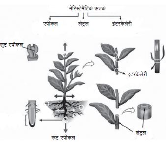 आम तौर पर पेड़ों की वृद्धि पूरा जीवनभर जारी रहती है क्योंकि उनमें विशेष मेरिस्टेमैटिक कोशिकाएँ होती हैं। उनमें निरन्तर विभाजन जारी रहता है और इसलिए ये कोशिकाएँ पौधों में निरन्तर वृद्धि का प्रमुख कारण होती हैं। मेरिस्टेमैटिक कोशिकाओं या मेरिस्टेम को पेड़ पर उनके स्थान के अनुसार वर्गीकृत किया जाता है: एपीकल (जड़ों और तनों की ऊपरी सतह पर स्थित), लेटरल (संवहनी में स्थित) और अन्त: इन्टरकेलरी (इंटर्नोड या तनों के उन क्षेत्रों के बीच जहाँ पत्ते लगे होते हैं, उदाहरण के लिए -- घास)। एपीकल मेरिस्टेम्स से पौधे का प्राथमिक विकास होता है। और लेटरल मेरिस्टेम तने की मोटाई में वृद्धि के लिए ज़िम्मेदार होते हैं।
