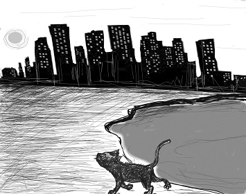 अचानक कारें हर तरफ से उस पर चीखने लगीं। तमतमाए चेहरे उसको घूर रहे थे मगर बिल्ली ने भागमभाग की इस सारी चिड़चिड़ाहट को पूँछ से किनारे किया और फिर से चल पड़ी। रास्ते में उसने तालाब देखा। तालाब जो हमारे शहर का ताज़ था, आज शान्त था, सुस्त नीला चमक रहा था। अब वह हर दिन ऑफिस जाते हुए इसके पास से गुज़रेगी। “लौटते में शायद मैं इसमें तैरूँगी या किनारे बैठकर देखूँगी, इन्तज़ार करूँगी कि मौत की तमन्ना में कोई मछली मेरे मुँह में कूद जाए।” उसने खुद से कहा।