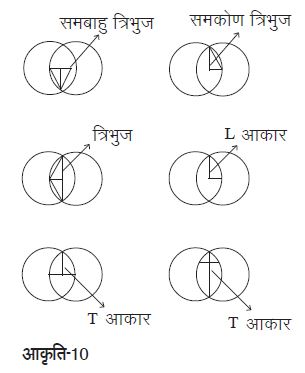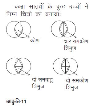 कक्षा सातवीं के बच्चों ने चित्र में मोटी रेखाओं से बने त्रिभुज को समद्विबाहु त्रिभुज के रूप में पहचाना। जब मैंने इसका कारण पूछा तो उन्होंने जवाब दिया कि त्रिभुज की दो भुजाएँ बराबर हैं क्योंकि वे दो समान वृत्तों की त्रिज्याएँ हैं, और तीसरी भुजा (वृत्तों के प्रतिच्छेद बिन्दुओं को जोड़ने वाला रेखाखण्ड) इन दो भुजाओं के बराबर नहीं है। बच्चों के एक अन्य समूह ने त्रिभुज की भुजाओं को नापकर देखा और यह निष्कर्ष निकाला कि यह एक समद्विबाहु त्रिभुज है। कुछ बच्चों ने व्यास ॠए और क्क़् को बनाया और यह निष्कर्ष निकाला कि चूँकि व्यास त्रिभुज के बीच में है इसलिए त्रिभुज के दोनों ओर की भुजाएँ बराबर होंगी।