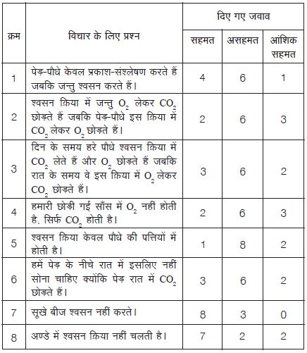 इस सारणी में दिए गए प्रश्नों तथा प्रतिभागियों की तरफ से आए उत्तरों पर गौर करें तो लगभग सभी प्रश्नों के उत्तर में विविधता है लेकिन सबसे ज़्यादा मतभेद प्रश्न 1, 3, 7, 8 में देखने को मिले। इसके कारणों पर बात करें तो प्रकाश-संश्लेषण और श्वसन, दोनों प्रक्रियाओं का सम्बन्ध गैसों के आदान-प्रदान से है। आम तौर पर इस पाठ को पढ़ाते समय हमारे बीच इन दोनों के अन्तर पर गम्भीरतापूर्वक बात नहीं होती है। उच्च प्राथमिक स्तर पर विज्ञान पढ़ाने में प्रयोगों का ज़्यादा इस्तेमाल नहीं होता क्योंकि विज्ञान के बारे में एक गलत धारणा यह भी है कि इसको करने के लिए बहुत महँगे सामान एवं अच्छी प्रयोगशाला की ज़रूरत होती है जबकि ऐसा बिलकुल भी नहीं है।
