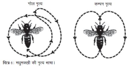 गोल नृत्य में मक्खी छत्ते के पास गोले में नाचती हैं। यह छत्ते से 80 मीटर के घेरे में भोजन मौजूद होने की सूचना है। कम्पन नृत्य में मधुमक्खियाँ 8 के आकार में नाचती हैं। 8 के बीच के हिस्से में कम्पन नृत्य होता है। इस दौरान वे अपने पिछले हिस्से में कम्पन करती हैं। इसकी आवृत्ति भोजन के स्रोेत की दूरी का सूचक है।