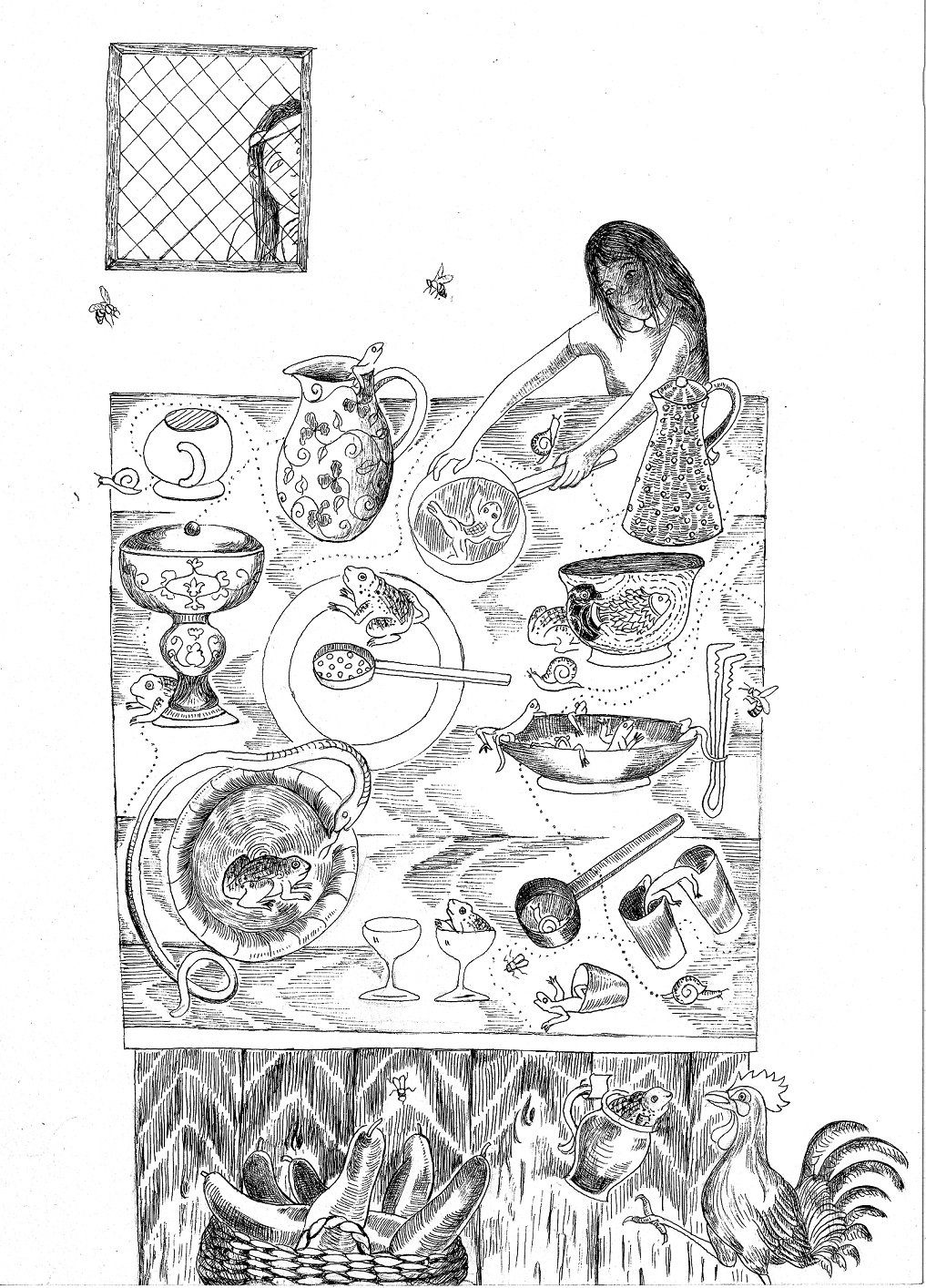उस हर प्लेट पर, जो उसने वहाँ सुखाने के लिए रख छोड़ी थी, एक मेंढक दुबका हुआ था; एक डेगची में एक साँप कुण्डली मारे बैठा था, सूप के एक कटोरे में गिरगिट भरे हुए थे, सारे ग्लासों पर चिपचिपी जोंकें रंगबिरंगी लकीरें बना रहा थीं। पानी से लबालब भरे बेसिन में वह अकेली बूढ़ी सुनहरी मछली तैर रही थी।