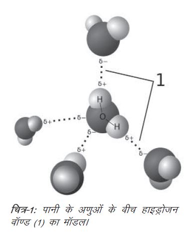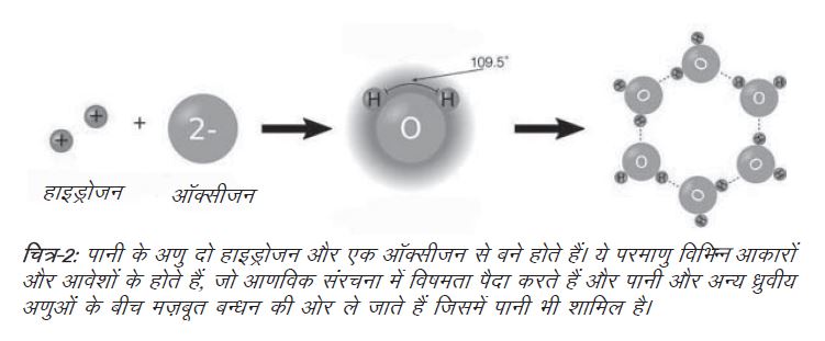 वैसे तो पानी का अणु मात्र तीन परमाणुओं (दो हाइड्रोजन और एक ऑक्सीजन) से बना है लेकिन इसकी अनोखी संरचना इसे असाधारण गुण प्रदान करती है। पानी एक अत्यन्त असममित अणु है। इसका O परमाणु दो H परमाणुओं से जुड़ा होता है। ये दोनों आबन्ध एक सरल रेखा में नहीं होते। और तो और, दोनों O-H आबन्ध ध्रुवीकृत होते हैं (अर्थात् इनमें आवेशों का वितरण एक समान नहीं होता)। इस ध्रुवीयता की वजह से पानी के अणु के तीनों परमाणु हाइड्रोजन आबन्ध नामक विशेष किस्म के बन्धन बना सकते हैं। पानी की जीवनदायी प्रकृति इन्हीं गुणधर्मों पर टिकी है।