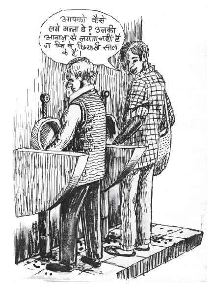 रात नौ बजे कार्यक्रम समाप्त हुआ, भीड़ के साथ सीढ़ियाँ उतरते हुए मुझे ‘प्रसाधन’ लिखा देखकर ख्याल आया कि इस बीच फारिग हो लूँ। भीड़ भी छँट जाएगी और तब आराम-से घर जा सकूँगा। मैं जाकर खड़ा हुआ ही था कि बगल में एक आदमी कुछ निढाल-सा, थके कदमों से आया और पेशाब करने लगा। मैंने उसकी तरफ देखा, वह रुआँसा हो रहा था। निगाह मिलने पर वह कुछ सकपका गया और नज़र चुराने लगा। मैंने पूछा, “आपको कैसे लगे मन्ना डे? उनकी आवाज़ से लगता नहीं है न कि वे छियासी साल के हैं?”
