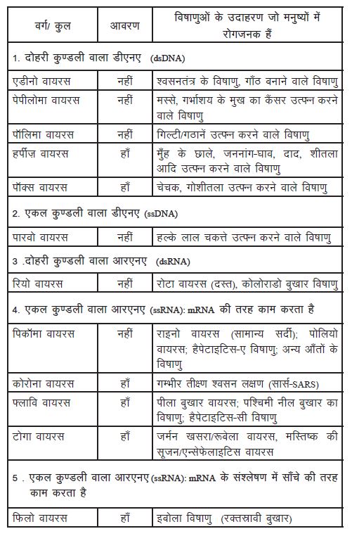 विषाणु दरअसल, बीमारी फैला सकने वाले/रोगकारक अणु हैं जिसमें प्रोटीन से ढके हुए नाभिकीय अम्ल यानी डीएनए या आरएनए मौजूद रहते हैं। कुछ विषाणुओं में इस प्रोटीन के बाहर एक अतिरिक्त आवरण भी होता है। किसी भी जीव के शरीर पर मौजूद जींस को मिलाकर जीनोम कहा जाता है। अनुवांशिक पदार्थ/जींस का ज़िक्र आते ही सबसे पहले हमारे दिमाग में दोहरी कुण्डली वाले डीएनए का ही ख्याल आता है, लेकिन विषाणु तो हैं ही कुछ हटके, इनकी अनुवांशिक इकाइयाँ डीएनए तथा आरएनए, दोनों के रूप में हो सकती हैं। ये डीएनए तथा आरएनए, दोनों ही एकल कुण्डली वाले या दोहरी कुण्डली वाले हो सकते हैं। इस आधार पर विभिन्न विषाणुओं में चार प्रकार के अनुवांशिक पदार्थों में से कोई एक प्रकार पाया जाता है। इन्हीं के आधार पर विषाणु विशिष्ट समूह बनाते हैं।