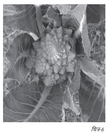 गोभी का सीज़न खत्म होने वाला था, तो अब्दुल भाई ने गोभी के खेतों में अपनी गाय एक लम्बी रस्सी से बाँधकर छोड़ रखी थी। गाय अपने पहुँच के घेरे में जहाँ-तहाँ घूम-घूम कर बची-खुची गोभियाँ निपटाने में लगी हुई थी। अब्दुल भाई से दुआ-सलाम होने के बाद उन्होंने मुझसे पूछा, “क्या आप भी वही देखने आए हैं?” मेरे हामी भरने के साथ ही वे मुझे गाय की पहुँच से दूर वाले खेत के उस हिस्से की ओर ले गए जहाँ वह गाँव-विख्यात गोभी लगी हुई थी। मैंने जो अद्भुत नज़ारा देखा, आप भी देखिए (चित्र-5)।