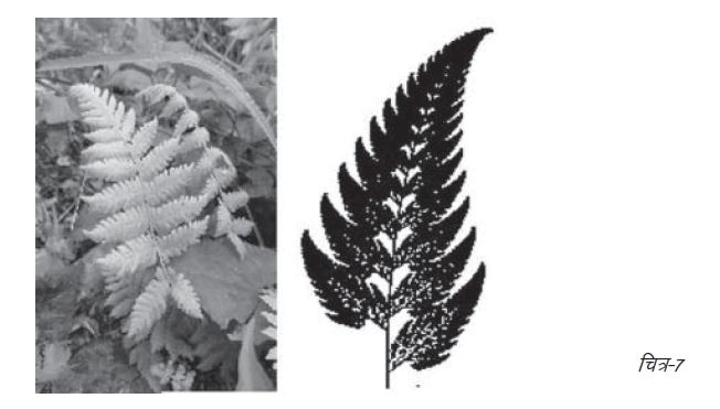 अब ज़रा चित्र-7 पर गौर फरमाइए। चित्र के बाईं ओर वाली तस्वीर मेरे घर के ठीक सामने उग आए एक फर्न या पर्णांग की है। इसे असमिया भाषा में बिहलागौनि कहते हैं। माना जाता है कि यह जोड़ों के दर्द को कम करने में मदद करता है। इसी की तरह दिखने वाली एक साग धेकिया को खाया भी जाता है। इसे अण्डे की भुर्जी के साथ पकाया जाता है और इसका ज़ायका शानदार होता है। इस तस्वीर में दाईं ओर के चित्र को कम्प्यूटर पर 50,000 बिन्दुओं से बनाया गया है। सियरपिन्स्की त्रिभुज के जैसे ही लेकिन एक थोड़े पेचीदा नियम से। इस चित्र को हम किसी भी अनुमाप (scale) पर देखें तो पाएँगे कि हर अनुमाप में फर्न की आकृति एक जैसी ही है। तो कल को अगर कोई आपसे पूछे कि पर्णांग की आकृति क्या है, तो बतलाना मत भूलिएगा कि यह दुनियाई यानी कि लगभग फ्रेक्टल है।