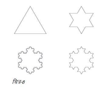 इसमें 1 से.मी. की लम्बाई के कुल सोलह रेखा-खण्ड हैं और उनकी कुल लम्बाई होगी 16 से.मी.। चित्र-3 को कुछ इस तरह भी देखा जा सकता है कि यह चित्र-2 के चार लघु-स्वरूपों (scaled-down) से मिलकर बना हुआ है। चित्र-3 के इन लघु-स्वरूपों की आकृति हूबहू चित्र-2 की आकृति से मिलती है, है न!