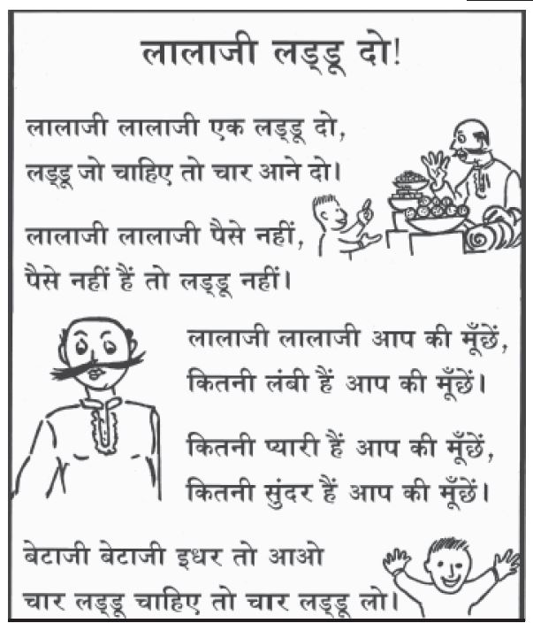 कक्षा 3 से 5 की शिक्षिका के पास लालाजी लड्डू दो... कविता का एक पोस्टर रखा हुआ था। शिक्षिका बच्चों के साथ एक गोल घेरे में बैठ गईं। शिक्षिका का ध्यान कविता पोस्टर पर ही था। वे बार-बार बच्चों को कह रही थीं, “ठीक से पकड़ो, सब को दिखना चाहिए।” शिक्षिका का ध्यान कक्षा-3 के दो बच्चों पर ज़्यादा था क्योंकि इन दोनों ही बच्चों को पढ़ना नहीं आता था। थोड़ी ही देर में शिक्षिका एक ऊँचे-से डिब्बे पर जाकर बैठ गईं ताकि सभी बच्चों को कविता पोस्टर दिखाई दे। शिक्षिका ने ज़ोर-से कविता का शीर्षक पढ़ा, “लालाजी लड्डू दो…।” इसके बाद बच्चों से कहा, “पहले इस कविता पोस्टर में दिए गए चित्रों में रंग भर दो, ताकि पोस्टर सुन्दर दिखाई दे और इसे पढ़ने में और मज़ा आए।” शिक्षिका ने बच्चों के सामने मोम कलर बिखेर दिए। बच्चे कविता पोस्टर के चित्र को बड़े ध्यान से देख रहे थे और आपस में बातचीत भी कर रहे थे।
