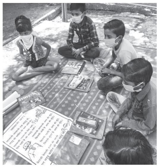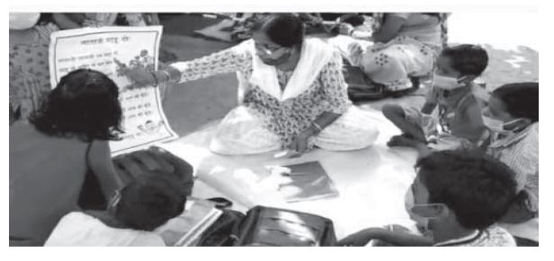 इसी दौरान कोविड-19 की वजह से शालाएँ बन्द हो गईं। जुलाई के महीने में राज्य शासन ने ‘हमारा घर हमारा विद्यालय' योजना की शुरुआत की। इस योजना के तहत शिक्षक बच्चों के घर जाकर पढ़ाने का काम कर रहे थे। होशंगाबाद ज़िले के कई गाँवों में हमारे कई साथियों ने गाँव-गाँव जाकर इस योजना में शासन की मदद की। मैं भी कई गाँवों में जाकर बच्चों के भाषा व गणित शिक्षण में मदद कर रही थी।