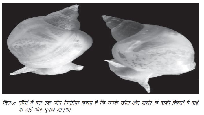 ‘दक्षिणहस्ती’ घोंघे (यानी वे घोंघे जिनकी खोल की कुण्डली नुकीले सिरे से शुरू करके घड़ी की सुइयों की दिशा में घूमती है) का दर्पण प्रतिबिम्ब किसी ‘वामहस्ती’ घोंघे पर ही फिट बैठेगा, जिसकी खोल घड़ी की उल्टी दिशा में घूमती है। किसी घोंघे के चिपचिपे अंग और हिस्से भी खोल के घुमाव का अनुसरण करते हैं। उनमें भी उसी तरह की ऐंठन होती है जैसे खोल में है। यह एक ऐसा अवलोकन था जिसने कुछ शोधकर्ताओं को इस गुणधर्म के उद्गम की खोजबीन करने को प्रेरित किया। और डेवलपमेंट नामक शोध पत्रिका में प्रकाशित अध्ययन के मुताबिक इस बुनियादी कुण्डली के पीछे एक इकलौते जीन का हाथ है।