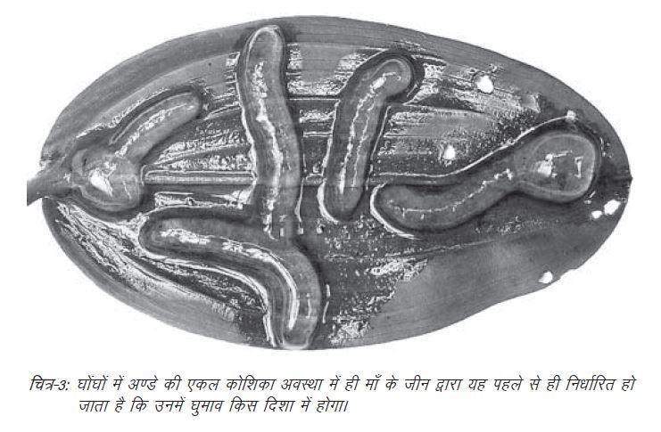 इसके बाद शोधकर्ताओं ने वामहस्ती घोंघों के विकास को थोड़ा और गहराई से परखा। इसके लिए उन्होंने इनकी सन्तानों पर ध्यान दिया। ऐसा इसलिए किया कि घोंघों का घुमाव उनकी माँ से प्राप्त जीन्स से निर्धारित होता है – यानी वे जीन्स जिन्होंने उस अण्डाणु का निर्माण किया था जिससे वे विकसित हुए हैं। अर्थात जब तक एक इकलौती अण्डाणु कोशिका का निषेचन होता है और वह विभाजित होकर दो कोशिकाएँ बनाती है, तब तक घोंघे के घुमाव की दिशा तय हो जाती है।