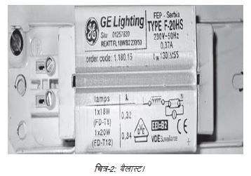 बैलास्ट एक विद्युत-चुम्बकीय उपकरण होता है। यह एक इंडक्टर के समान होता है जिसमें एक ठोस लौह कोर के आसपास ताँबे का तार लिपटा होता है। इसकी मदद से प्रतिदीप्त लैम्प का वोल्टेज नियंत्रित किया जाता है। पुराने पड़ चुके बैलास्ट में भिनभिनाहट इसलिए होती है क्योंकि ऐसा बैलास्ट वोल्टेज को ठीक से नियंत्रित नहीं कर पाता और बार-बार क्षति पहुँचाता रहता है। इस शोर को पैदा करने वाली परिघटना का वैज्ञानिक नाम मैग्नेटोस्ट्रिक्शन है।