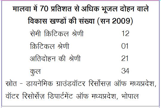 भूजल विशेषज्ञों का कहना है कि कुल भूजल भंडारों के 70 प्रतिशत भाग का दोहन ही सम्पोषणीय होता है, 70 से 90 प्रतिशत दोहन को सेमी क्रिटिकल, 70 से 100 प्रतिशत दोहन को क्रिटिकल तथा 100 प्रतिशत से अधिक दोहन को अतिदोहित भूजल की श्रेणी में रखा जाता है। मालवा में भूजल के दोहन की दृष्टि से ज़िले के आंकड़ों के बजाय विकास खण्ड स्तरीय आंकड़े अधिक उपयुक्त माने जाते है क्योंकि किसी-किसी ज़िले में किसी विकास खण्ड में भूजल भंडारों का दोहन 100 प्रतिशत से अधिक है तो कुछ विकास खंडों में 70 प्रतिशत से भी कम हो सकता है। कुओं और नलकूपों की बढ़ती संख्या के कारण भूजल के अतिदोहन के शिकार विकास खण्डों की संख्या तालिका में दी गई है।