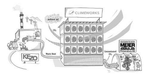 स्विटज़रलैंड की एक कंपनी क्लाइमवर्क्स इस वर्ष सितंबर-अक्टूबर से एक टेक्नॉलॉजी आज़माने जा रही है जिसके तहत हवा में से कार्बन डाईऑक्साइड को अलग करके ग्रीनहाउसों में भेजा जाएगा। ग्रीनहाउस में यह कार्बन डाईऑक्साइड पौधों की वृद्धि में सहायक होगी।