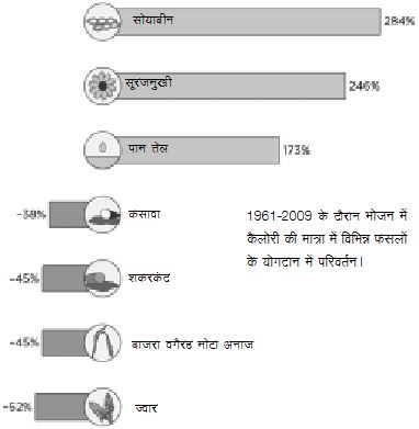 यहां दिए गए चित्र में देखा जा सकता है कि कैसे कुछ खाद्य वस्तुओं की खपत तेज़ी से बढ़ी है जबकि कुछ अन्य वस्तुओं की खपत में तेज़ी से कमी आई है। (स्रोत फीचर्स)
