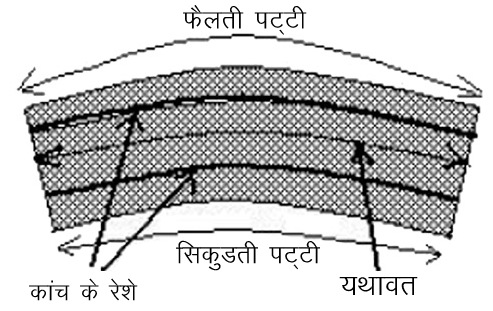 चित्र में दिखाया गया है कि कैसे प्लास्टिक में कांच के महीन रेशे डालने से वह मज़बूत बनता है। जब प्लास्टिक की पट्टी को मोड़ा जाता है तो ऊपरी आधे हिस्से में कांच के रेशों को फैलना पड़ता है। दूसरी ओर, निचले हिस्से के रेशे सिकुड़ते हैं। कांच के रेशों के फैलने और सिकुड़ने के कारण पट्टी को मुड़ने से रोका जाता है। यह पट्टी को ताकत और दृढ़ता देता है।
