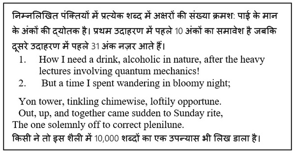 संख्या के प्रति कुछ उत्साही लोगों ने तो π के कई अंकों को याद करने के लिए मेमोरी एड्स का उपयोग किया है तो कई लोगों ने पाईफिलोलॉजी नेमोनिक तकनीक का इस्तेमाल कर इस संख्या को याद किया है। अक्सर, वे पद्यों का उपयोग करते हैं (जिसमें प्रत्येक शब्द में अक्षरों की संख्या क्रमश: π के अंकों से मेल खाती है)। इसे पाइलिश शैली भी कहा जाता है। ऐसे पद्यों के कुछ उदाहरण बॉक्स में देखिए।