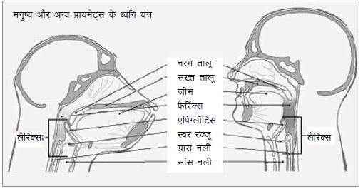 फ्रंटियर इन न्यूरोसाइन्स में प्रकाशित एक नए अध्ययन में बताया गया है कि विभिन्न प्रकार की आवाज़ें निकालने के लिए केवल ध्वनि यंत्र (साउंड बाक्स) ही उत्तरदायी नहीं होता। पूर्व में वैज्ञानिक विभिन्न प्रकार की आवाज़ निकालने के लिए साउंड बाक्स को ही ज़िम्मेदार मानते थे और भाषा के विकास में इसे महत्वपूर्ण समझते थे। हाल ही में प्रकाशित शोध के अनुसार गैर मानव प्राइमेट में भी आवाज़ उत्पन्न करने वाली संरचना होमिनिड के सहोदरों के समान ही है। एंजलिया रस्किन विश्वविद्यालय के प्राणि विद जैकब डुन के अनुसार यदि शरीर की आवाज़ निकालने वाली संरचना एक जैसी है तो मुख्य मुद्दा मस्तिष्क की क्षमता का हो जाता है।