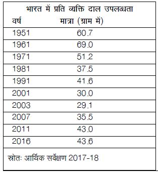भारत में सदियों से दालें जनसाधारण के लिए प्रोटीन का सबसे सामान्य व महत्त्वपूर्ण रुाोत रही हैं। अत: यह गहरी चिंता का विषय है कि दाल की प्रति व्यक्ति उपलब्धता में बहुत गिरावट आई है। इस स्थिति को तालिका से समझा जा सकता है।