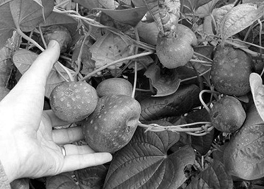 मैंने उससे पूछा यह कहां से लाए हो तो उसने कहा, सर पीछे बगीचे में ज़मीन पर ढेर सारे पड़े हैं। मैंने वहां जाकर देखा तो एक बेल बबूल के पेड़ पर चढ़ी थी जिसके पत्ते बड़े-बड़े पान जैसे थे। ध्यान से देखने पर पत्तों का रूप रंग कुछ-कुछ जाना पहचाना लगा। सिर उठाकर ऊपर की ओर देखा तो नज़र आया कि बेल की प्रत्येक पत्ती और तने के बीच ऐसी कई गठानें वहां लटकी हुई हैं। पत्तों को देखकर लगा कि हो ना हो यह गराडू की बेल है। परंतु गराडू तो ज़मीन के अंदर लगते हैं वह भी बहुत बड़े-बड़े और बेडौल। यह तो लगभग गोल मटोल रचना है। खोजबीन करने पर पता चला कि यह बेल तो एयर पोटैटो यानी हवाई आलू की है।