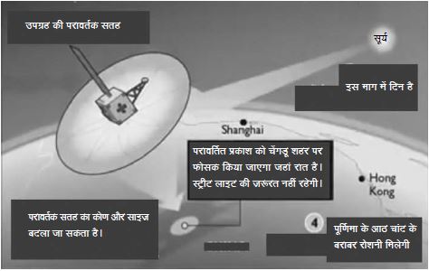 सवाल उठता है कि यह नकली चांद काम कैसे करेगा? चेंगडू एयरोस्पेस के अधिकारियों के मुताबिक यह नकली चांद एक शीशे की तरह काम करेगा, जो सूर्य की रोशनी को परावर्तित कर पृथ्वी पर भेजेगा। यह चांद हूबहू पूर्णिमा के चांद जैसा ही होगा मगर, इसकी रोशनी असली चांद से आठ गुना अधिक होगी। नकली चांद की रोशनी को नियंत्रित किया जा सकेगा। यह पृथ्वी से 500 कि.मी. की दूरी पर स्थित होगा। जबकि असली चांद की पृथ्वी से दूरी 3,80,000 कि.मी. है।