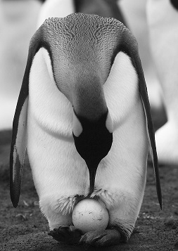 पेंग्विन हज़ारों की बस्ती में अंडे देते हैं। हरेक मादा एक अंडा देती है और फिर वह कई महीनों तक भोजन की तलाश में समुद्र की ओर निकल जाती हैं। अंडों की देखभाल का काम नर पेंग्विन्स करते हैं। ऋणात्मक तापमान में अंडों को संभालने के लिए नर पेंग्विन वास्तव में गर्मी के रुाोत में तबदील हो गए हैं। अन्य पक्षियों के समान पेंग्विन का शरीर भी पिच्छों से ढंका होता है। ये पिच्छ ऊष्मा के कुचालक होते हैं और उनके शरीर को वातावरण की ठंड/गर्मी से अलग रखते हैं। एंपरर पेंग्विन के पेट का एक हिस्सा होता है जो पिच्छों से ढंका नहीं होता। इसे शिशु थैली कहते हैं। पेंग्विन अंडे को अपने दोनों पंजों पर टिका कर इसी थैली से सटाकर रखते हैं और पेट के पिच्छों से उसे ढंक लेते हैं। इस प्रकार से अंडा वातावरण की अतियों से महफूज़ रहता है। और पिता के शरीर की गर्मी उसे मिलती रहती है।