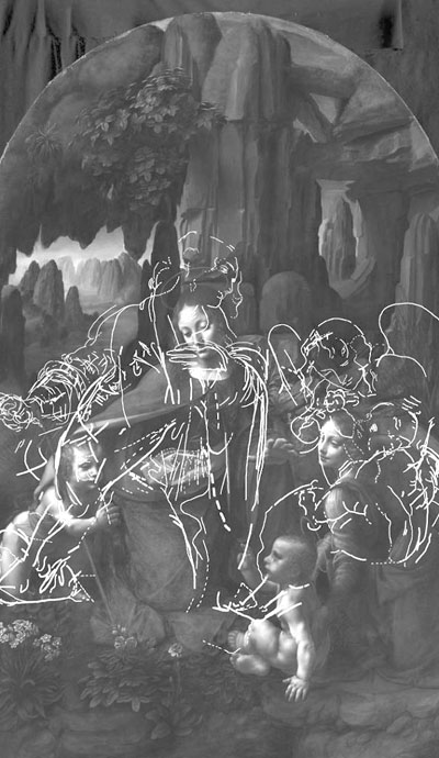 दरअसल 2005 में नेशनल आर्ट गैलरी ने दी वर्जिन ऑफ दी रॉक्स पेंटिंग की इंफ्रारेड रिफ्लेक्टोग्राफी की मदद से इमेंज़िंग की थी जिसमें उन्हें पता चला था कि एक अन्य चित्र इस पेंटिंग के पीछे छिपा हुआ है जिसमें मैरी की आंखे बिलकुल अलग जगह पर बनी हुई थीं जिसे बाद में बनाए गए चित्र के रंगों से पूरा ढंक दिया गया था।