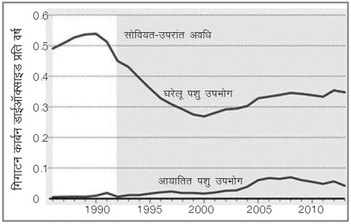 सोवियत संघ में कम्युनिस्ट शासन के दौरान पशुपालन से प्राप्त मांस वहां के लोगों का मुख्य भोजन हुआ करता था। 1990 में एक औसत सोवियत नागरिक प्रति वर्ष 32 किलोग्राम मांस खाता था जो उस समय पश्चिमी युरोप की प्रति व्यक्ति खपत से सवा गुना और वैश्विक औसत से 4 गुना ज़्यादा था।