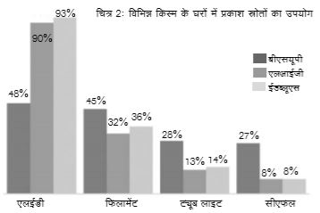 हमने यह भी देखा कि मकान की मानक साइज़ के लिए एलईडी की संख्या घरेलू परिसंपत्तियों या परिवार की उपभोग करने की क्षमता से सम्बंधित है। अपेक्षाकृत समृद्ध परिवार अधिक एलईडी खरीदते हैं, हालांकि फिलामेंट बल्ब की एक निश्चित संख्या बनी रहती है। हालांकि चित्र 2 एलईडी उपयोग की एक काफी उच्च दर दर्शाता है, वहीं उसमें यह भी नज़र आता है कि सभी घरों ने इस परिवर्तन को नहीं अपनाया है। विशेष रूप से, बीएसयूपी घर - जो सबसे कम आय वाले हैं - उनमें ईडब्ल्यूएस और एलआईजी घरों (चित्र 2) की तुलना में एलईडी उपयोग की दर करीब आधी है। अधिकांश बीएसयूपी घरों में एलईडी की संख्या शून्य है।