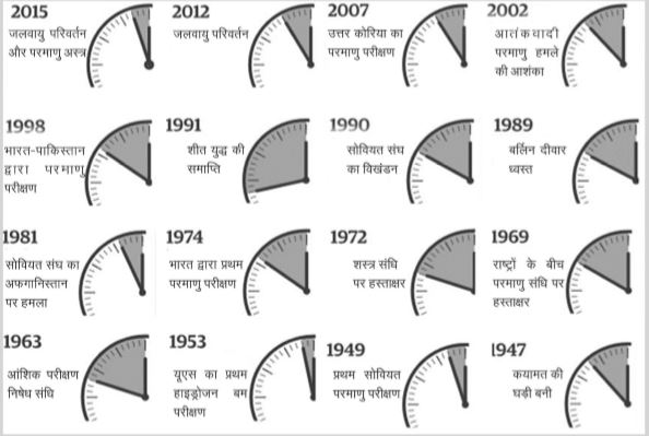 वर्ष 1947 में दुनिया भर के वैज्ञानिकों ने मिलकर एक घड़ी स्थापित की थी जो यह बताती है कि मानवजाति खुद का सर्वनाश करने से कितने समय की दूरी पर है। हाल में बुलेटिन ऑफ एटॉमिक साइन्टिस्ट्स ने कयामत की इस घड़ी के कांटों को मध्यरात्रि के थोड़ा नज़दीक दर्शाने का फैसला लिया है। यह फैसला बढ़ते परमाणविक खतरों और बेलगाम जलवायु परिवर्तन के मद्देनज़र लिया गया है। बुलेटिन के अनुसार आज हम कयामत से उतनी ही दूर हैं जितने द्वितीय विश्व युद्ध के समय थे।