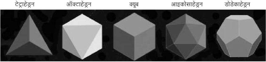 अंक गणित और समतल ज्यामिति के अलावा ठोस ज्यामिति के क्षेत्र में भी पायथागोरस का योगदान बहुत ही महत्वपूर्ण रहा। उपलब्ध साक्ष्यों से पता चलता है कि पायथागोरस ने नियमित आकृति वाले पांच ठोस - टेट्राहेड्रन (पिरामिड), क्यूब (घन) ऑक्टाहेड्रन, डोडेकाहेड्रन तथा आइकोसाहेड्रन की निर्माण विधि विकसित की थी। हालांकि पायथागोरस द्वारा अनेक आकृतियों वाले ठोसों के निर्माण की विधि विकसित की गई परन्तु उन्हें सबसे अधिक प्रिय था डोडेकाहेड्रन। पायथागोरस के मतानुसार पेंटागन शरीर का निर्माण करने वाले पांच तत्वों का प्रतिनिधित्व करता है। इसी कारण पायथागोरियन मत मानने वालों द्वारा पेंटागन को धार्मिक चिन्ह के रूप में उपयोग में लाया जाता था। जब पायथागोरियन मतावलम्बी एक-दूसरे से कहीं मिलते थे तो उनका पहचान-चिंह स्टार पेंटागान ही होता था। इस चिंह को वे लोग ‘सेहत (हेल्थ)’ कहा करते थे।