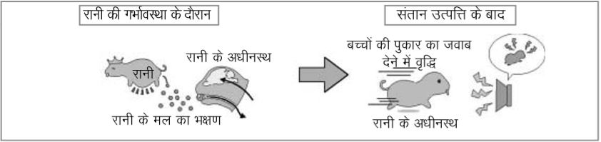 रेगिस्तानी मोल चूहे (Heterocephalus glaber) पूर्वी अफ्रीका के रेगिस्तान में भूमिगत कॉलोनी में रहते हैं। कुछ प्रजनन करने वाले नर चूहों के अलावा, कॉलोनी के शेष सदस्य अपना सारा समय भोजन के लिए कंद की तलाश, शिकारियों से बचाव और रानी के बच्चों की देखभाल में व्यतीत करते हैं। रानी के बच्चों की देखभाल करने के इस व्यवहार ने जीव विज्ञानियों का ध्यान आकर्षित किया। आम तौर पर मादा स्तनधारियों में हार्मोन में होने वाले बदलाव मादा को अपने बच्चों की देखभाल करने को प्रवृत्त करते हैं। लेकिन इस रेगिस्तानी मोल में हार्मोन उत्पादन करने वाले सहायक प्रजनन अंग रानी के अलावा अन्य मादाओं में कभी विकसित नहीं होते। तो सवाल यह है कि फिर उनमें मातृत्व भावना कैसे पैदा होती है?