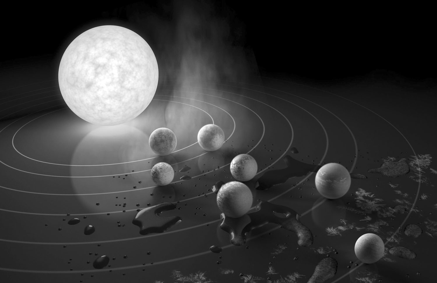 खगोलविदों के अनुसार हबल दूरबीन से प्राप्त चित्रों को देख कर सहज ही अनुमान लगाया जा सकता है कि लगभग चार अरब वर्ष पूर्व सूय के इर्द-गिर्द ग्रहों का निर्माण किस प्रकार हुआ होगा। हबल से प्राप्त चित्र कुछ वैज्ञानिकों द्वारा ग्रहों की उत्पत्ति के सम्बंध में प्रस्तुत परिकल्पनाओं की पुष्टि करते हैं। ये चित्र इस बात का संकेत देते हैं कि किसी नवजात तारे के चारों ओर मौजूद धूल कण इतनी तेज़ी से घूमते रहते हैं कि नवजात तारे का आकर्षण उन्हें अपनी ओर खींच नहीं पाता है। इसकी बजाय वे नवजात तारे के चारों ओर तश्तरी की आकृति में फैलते जाते हैं। यही कण समय के साथ विभिन्न ग्रहों के रूप में परिणित होकर उस नवजात तारे का चक्कर लगाने लगते हैं।