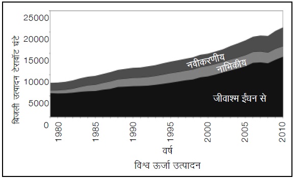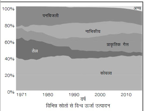 डैटा से पता चलता है कि नवीकरणीय संसाधनों पर ध्यान देने और उनकी बढ़ती उपस्थिति की रिपोर्ट्स के बावजूद विभिन्न प्रकार के ऊर्जा उत्पादन में जीवाश्म र्इंधन की हिस्सेदारी लगभग आधी सदी से अपरिवर्तित रही है। दिए गए रेखाचित्र से पता चलता है कि नवीकरणीय संसाधनों में काफी धीमी वृद्धि हुई है, इसी तरह नाभिकीय उर्जा की हिस्सेदारी भी कम हुई है, कोयले का उपयोग अपरिवर्तित रहा है और तेल की जगह प्राकृतिक गैस का उपयोग होने लगा है।