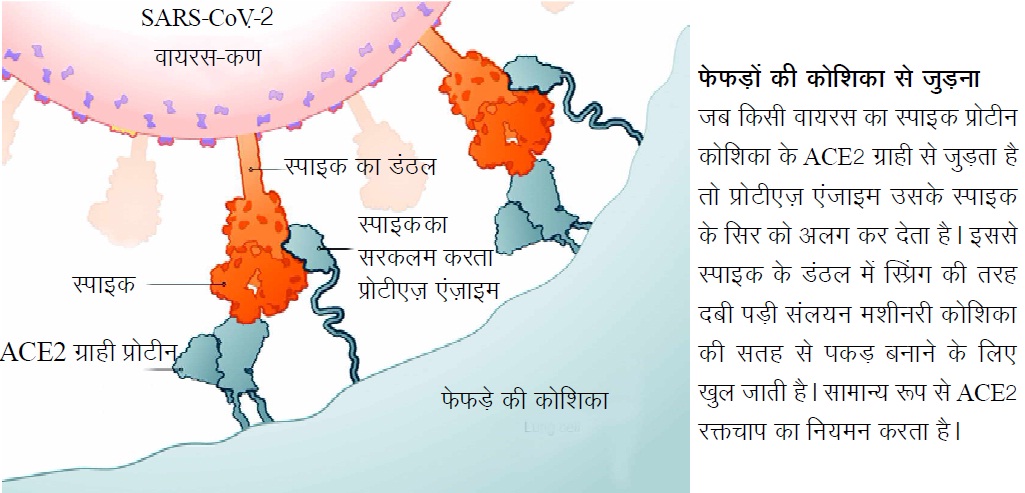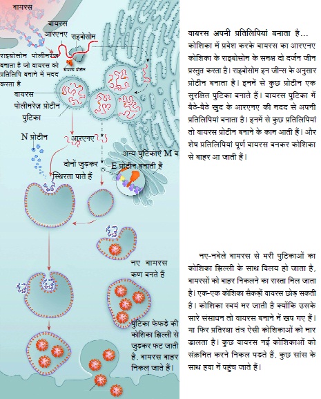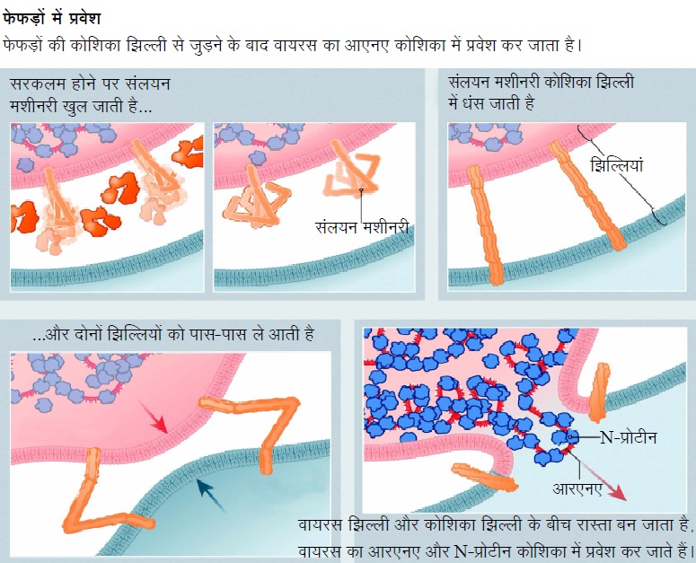साइंटिफिक अमेरिकन में प्रकाशित एक चित्रांकन विस्तारपूर्वक बताता है कि कैसे सार्स-कोव-2 मानव कोशिका में प्रवेश करता है, अपनी प्रतिलिपियां बनाता है, जो अन्य कोशिकाओं में प्रवेश करता है, और संक्रमण फैलता चला जाता है।