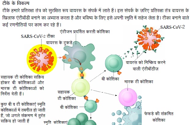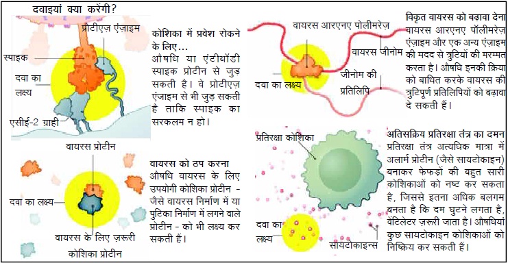 कोविड-19 से लड़ने में विभिन्न प्रयोगशालाएं 100 से अधिक दवाओं का परीक्षण कर रही हैं। इनमें से अधिकांश औषधियां सीधे-सीधे वायरस को नष्ट नहीं करतीं बल्कि इनकी राह में बाधा उत्पन्न करती हैं ताकि शरीर की प्रतिरक्षा प्रणाली को संक्रमण का खात्मा करने का समय मिल जाए। एंटीवायरल औषधियां या तो वायरस को फेफड़े की कोशिका से जुड़ने से रोकती हैं, या यदि वायरस कोशिका में प्रवेश कर चुका है तो उसे प्रतिलिपियां बनाने से रोकती हैं, या प्रतिरक्षा प्रणाली की उस अति-प्रतिक्रिया को कम करती हैं जिससे संक्रमित लोगों में गंभीर लक्षण पैदा हो सकते हैं। दूसरी ओर, टीके प्रतिरक्षा प्रणाली को भविष्य में संक्रमण से जल्दी और प्रभावी रूप से लड़ने के लिए तैयार करते हैं।