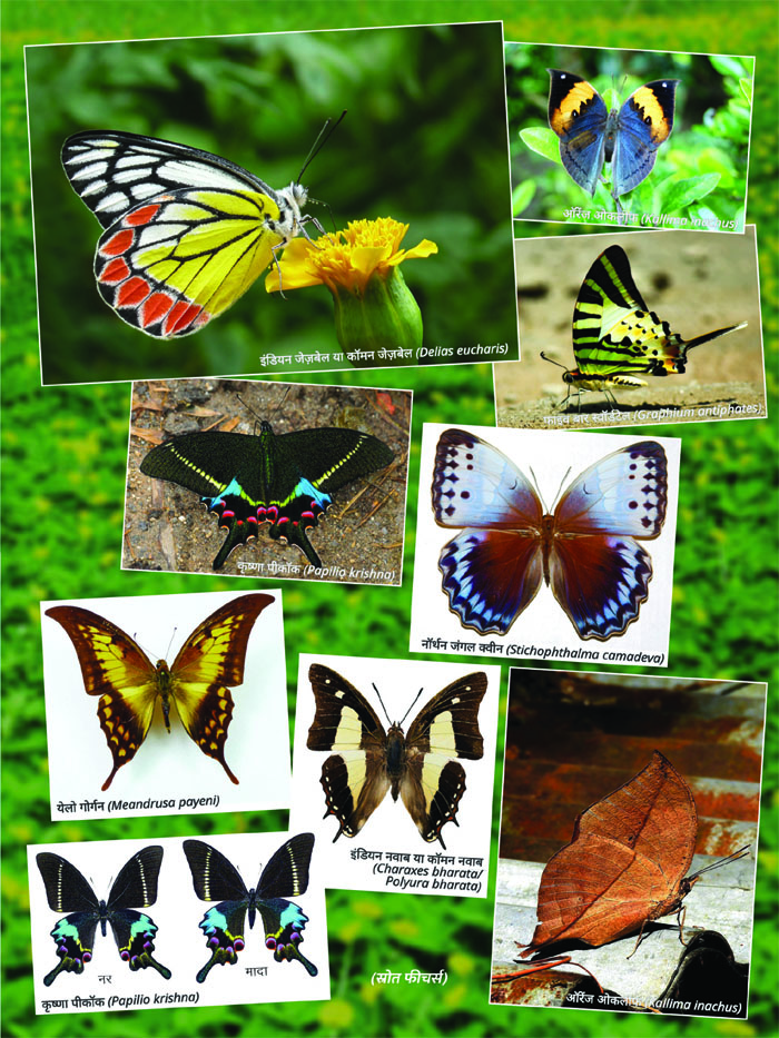 1. फाइव बार स्वॉर्डटेल (Graphiumantiphates): इस प्रजाति को पहली बार 1775 में पीटर क्रैमर द्वारा वर्णित किया गया था। यह पश्चिमी घाट के सदाबहार वनों, पूर्वी हिमालय एवं उत्तर-पूर्वी भारत में पाई जाती है। इसके पीछे के पंखों पर काली तलवार के समान पूंछ जैसी संरचना से इसे पहचाना जाता है। पंखों पर काले सफेद पट्टे पर हरे-पीले रंग का विन्यास होता है।
