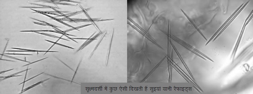 ये सुइयां कैल्शियम ऑक्ज़लेट की बनी होती हैं। ये सुइयां जिन कोशिकाओं के अंदर होती है उन्हें इडियोब्लास्ट कोशिकाएं कहा जाता है। यह तो हम जानते हैं कि कोशिकाओं में कोशिकांग होते हैं। कोशिकाएं अपने सामान्य कामकाज के दौरान कई पदार्थों का निर्माण करती हैं। ये पदार्थ कोशिकाओं में एक खास आकृति में जमा हो जाते हैं। इन पदार्थों को कोशिका समावेशन (सेल इंक्लूज़न) कहा जाता है। यानी कोशिका में निर्जीव पदार्थों का समावेशन। जैसे आलू में स्टार्च के कण, नागफनी और अकाव में सितारे के आकार के कैल्शियम ऑक्ज़लेट के कण इत्यादि।