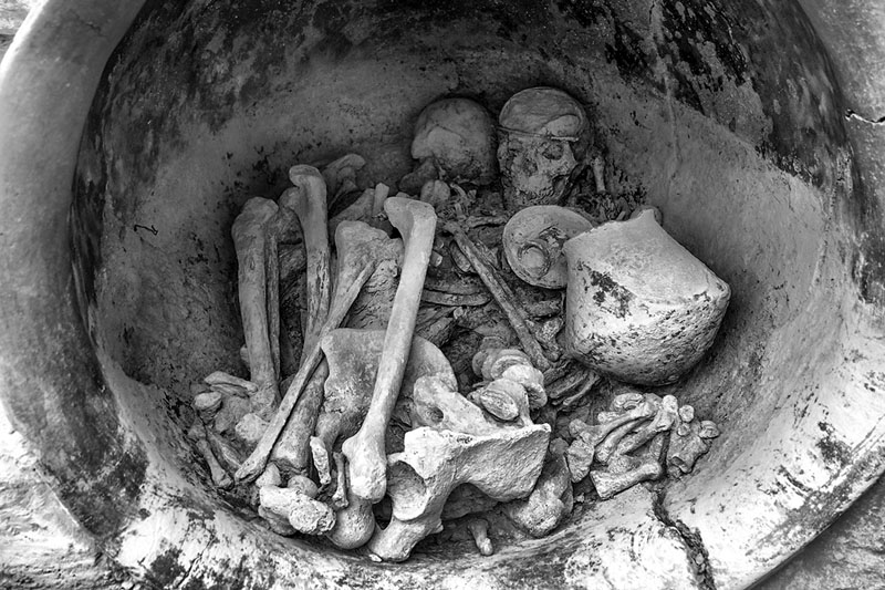 कमरे के फर्श के नीचे मिट्टी का एक बड़ा पात्र दफन था जिसमें एक पुरुष और एक महिला का कंकाल था। रेडियोकार्बन डेटिंग ने पता चलता है कि उनकी मृत्यु 1650 ईसा पूर्व के आसपास हुई होगी। मृत्यु के समय पुरुष की उम्र लगभग 35-40 वर्ष होगी और महिला की उम्र लगभग 25-30 वर्ष होगी। शोधकर्ताओं को उनकी मृत्यु का कारण स्पष्ट नहीं हो पाया, क्योंकि उनके कंकाल में किसी तरह की घातक चोट के निशान नहीं थे। कंकालों के आनुवंशिक विश्लेषण से यह पता चला है दोनों कंकाल आपस में सम्बंधी (एक ही वंश के) नहीं थे। लेकिन उन दोनों की एक बेटी थी जिसकी मृत्यु बचपन में ही हो गई थी, और उसका शव वहीं पास में दफन था।