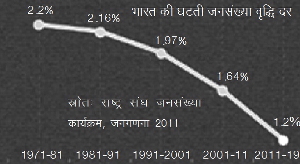 हालांकि, कुछ राहत देने वाली खबर भी है। हाल ही में संयुक्त राष्ट्र जनसंख्या कोश द्वारा जारी एक रिपोर्ट बताती है कि 2010-2019 के दौरान भारत की जनसंख्या वृद्धि दर काफी धीमी पड़ी है। रिपोर्ट के अनुसार, 2001-2011 के दशक की तुलना में 2010-2019 के दशक में भारत की जनसंख्या वृद्धि 0.4 अंक कम होने की संभावना है। 2011 की जनगणना के अनुसार 2001-2011 के बीच औसत वार्षिक वृद्धि दर 1.64 प्रतिशत थी।