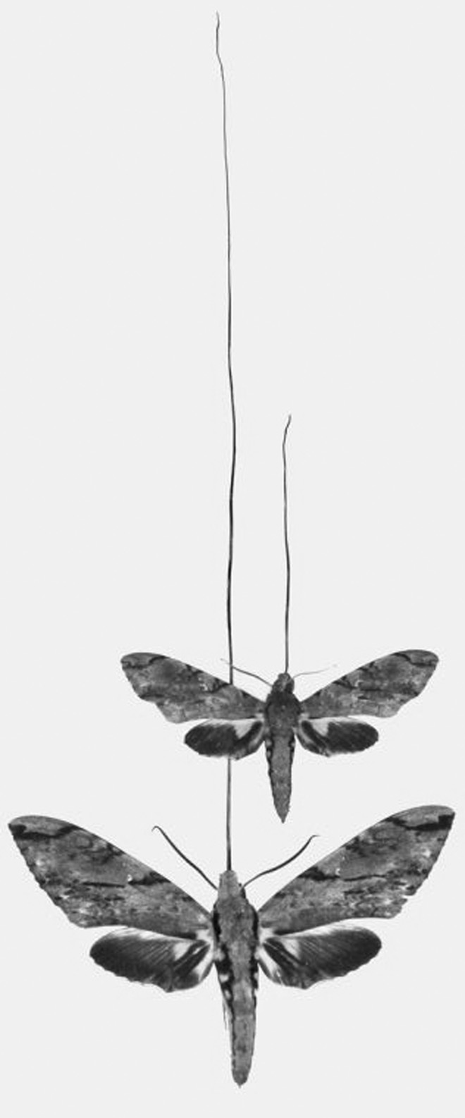 इस पतंगे का इतिहास बड़ा दिलचस्प है। चार्ल्स डार्विन ने इस तरह के जीव के अस्तित्व की भविष्यवाणी तब कर दी थी जब उन्होंने पहली बार एंग्रैकम सेस्क्विपेडेल नामक ऑर्किड का डील-डौल देखा था (जिसे देखकर उनके मुंह से निकला था, "अरे! कौन सा कीट इससे मकरंद चूस सकता है?")। इसके लगभग 2 दशक बाद, 1903 में, वास्तव में ऐसा पतंगा मिला था। लेकिन तब से ही इसे एक्स. मॉरगेनी नामक प्रजाति की उप-प्रजाति ही माना जाता रहा है, जो मुख्य द्वीप पर पाया जाता है। लेकिन अब नहीं।